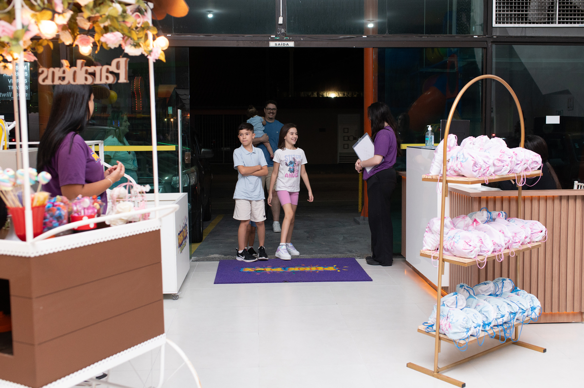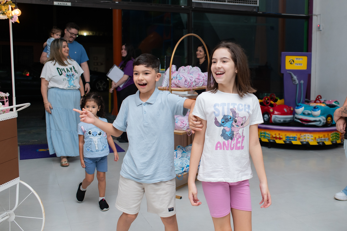 Ela chegou achando que era só mais um passeio… mas foi só abrir a porta do Plink Plok, em Jacareí, que tudo mudou. O tema do Stitch, as cores, os detalhes — tudo esperando por ela. Os pais estavam super ansiosos, os irmãos mal conseguiam segurar a empolgação. E Lavínia… ficou apaixonada.